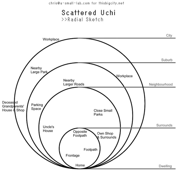 Extrait « Au Japon, «public» est plus d’une construction mentale que d’une présence physique »et le concept de« vie privée »n’a jamais pris racine. Le plus proche approximation natif japonais de public-privé peut être uchi (famille, clan, groupe)-soto (ce qui n’est pas uchi) où uchi s’étend de l’Ouest «privé» au «privé d’autres« plus «public». Une histoire et le présent des quartiers proches, le papier-minces murs et les portes coulissantes qui s’ouvrent sur la rue évoquent la pénétration de la vie quotidienne dans l’espace public. La pratique de la mémoire et le courant / la conception des quartiers entiers considèrent comme «chez soi», avec des parcs comme multifonctionnels mètres communs. »