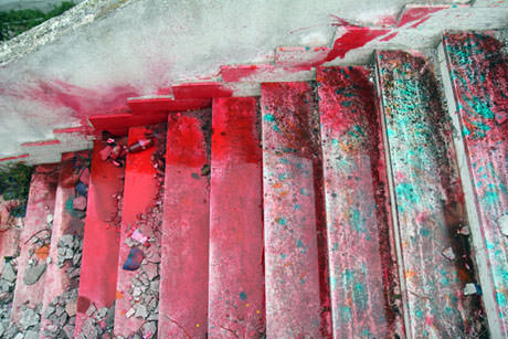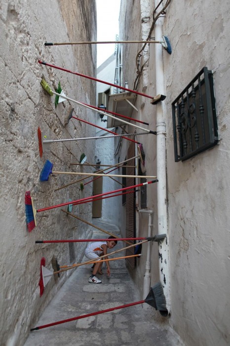 Brad Downey, vous connaissez? cet artiste américain (Louisville) fait du land art urbain mettant des éléments banals dans des conditions exceptionnelles. Son travail est toujours motivé par une volonté de faire franchir les usagers de la ville du réel au surréaliste artistique… parfois même en posant question (croix gammée).
