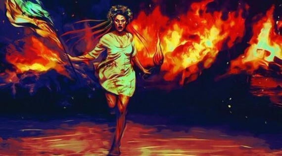 l’art (et l’artiste), par son expression spécifique, capte le moment qui ne peut être qu’unique. Cette oeuvre d’un inconnu est, à mon humble avis, extraodinaire. Elle transcende à la foir l’ambiance brûlante de Kiev mais aussi le sens de l’expression de cette révolution qui à bien des égards ressemble à la révolution française. A cet effet, la peinture de DELACROIX que je mets en comparaison n’est pas innocente…. ET cette femme, à la fois la parfaite ukrainienne traditionnelle et pleine de modernité, courant avec un cocktail Molotiv à la main ne peut vous laisser indifférent, telle la beauté et la force de la révolution, un mot définitivement féminin! Elle montre la voie à travers les flammmes comme elle porte un drapeau (liberté, égalité, fraternité) sur les corps morts pour la liberté.
