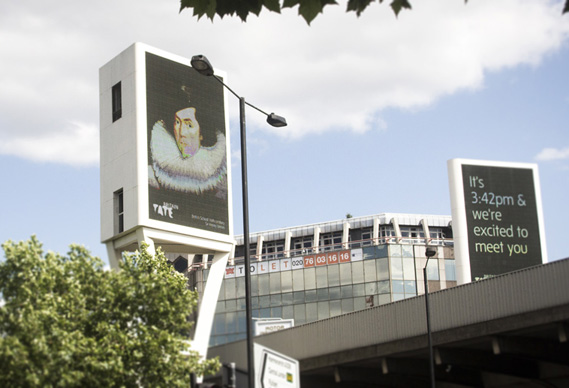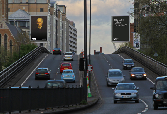La Tate a vu son sponsoring diminuer de manière significative depuis quelques années et s’est donc lancée dans une importante campagne de publicité… mais pas n’importe comment. En effet, des portiques urbains ont été érigés aux portes de Londres avec des tableaux de maîtres comme appuis commercial. Ces portiques sont reliés à bases de données correspondantes aux différents trafics.