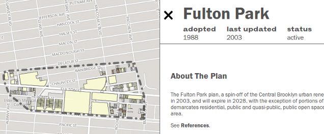 « 596 Acres a fait équipe avec Partner & Partners et Smartsign pour produire une carte complète en ligne montrant tous les plans directeurs de quartier adoptées pour New York. Il nous a fallu près de deux ans pour donner suite à une demande de liberté droit à l’information pour obtenir les dossiers de ces plans et les traduire minutieusement en feuilles de calcul lisibles par les ordinateurs et faire cette carte. »