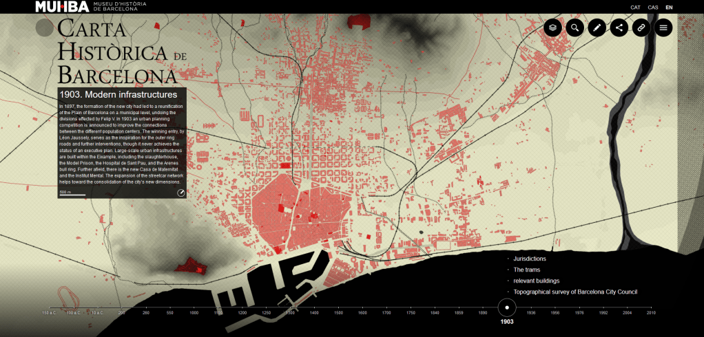 Le musée d’histoire de Barcelone vient de publier une carte, ou plutôt 16 cartes, dynamique de l’évolution de la ville entre 150 av. J.-C. et 2010. Ce n’est pas la première expérience de carte dynamique qui est mise en œuvre et reconnaissons ici la qualité technique du travail réalisé par les historiens qui est un véritable outil de compréhension de l’urbanisation de Barcelone.