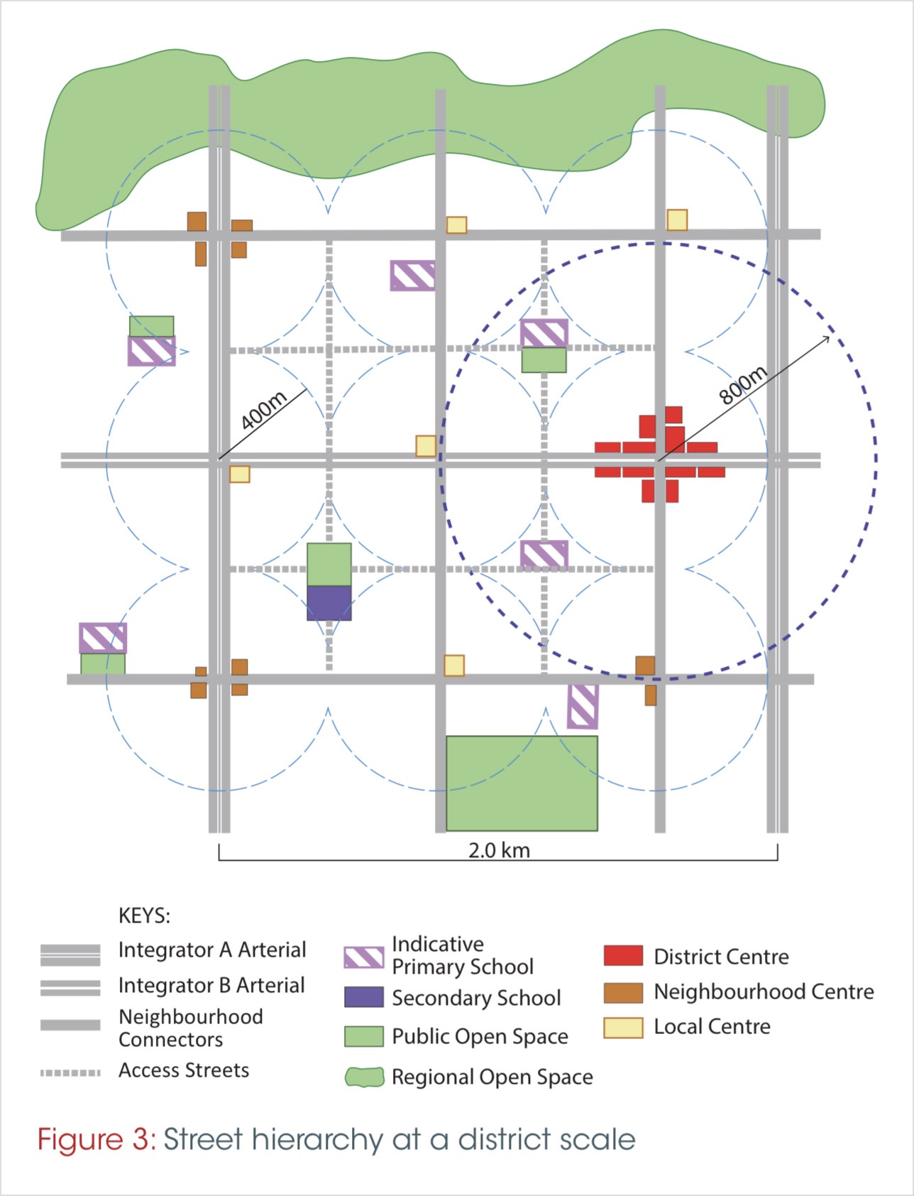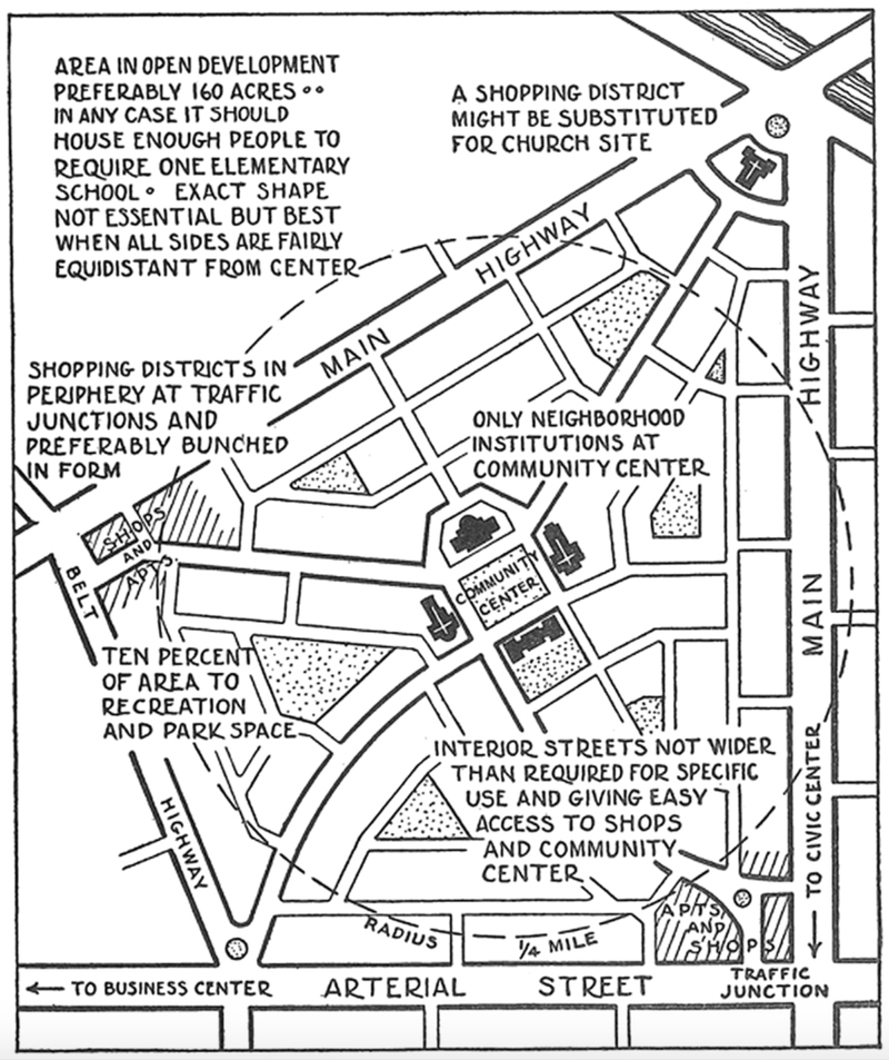 Communément, chaque arrêt de bus doit se situer entre 300 et 400 mètres selon la cadence et la capacité. Il en va de même pour le métro. Un facteur de deux est utilisé pour proposer des stations tous les 800 m. C’est ainsi que le diagramme de Perry avec le placement de la centralité au cœur du cercle par la création de place, salle communautaire, magasins, est resté particulièrement présent dans la conception des nouveaux quartiers de ville jusqu’au début des années 80. Paradoxalement, si le concept s’applique à favoriser le piéton, les interfaces entre les cercles déterminaient également les grandes artères et boulevards… qui ont favorisé petit à petit l’arrivée de l’automobile.