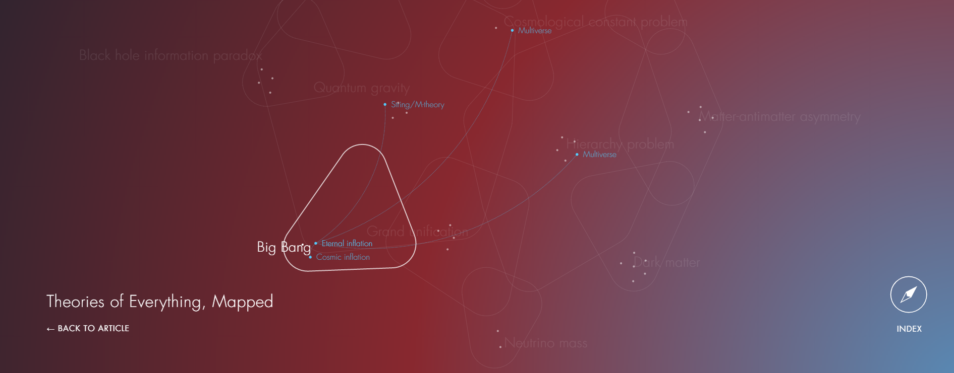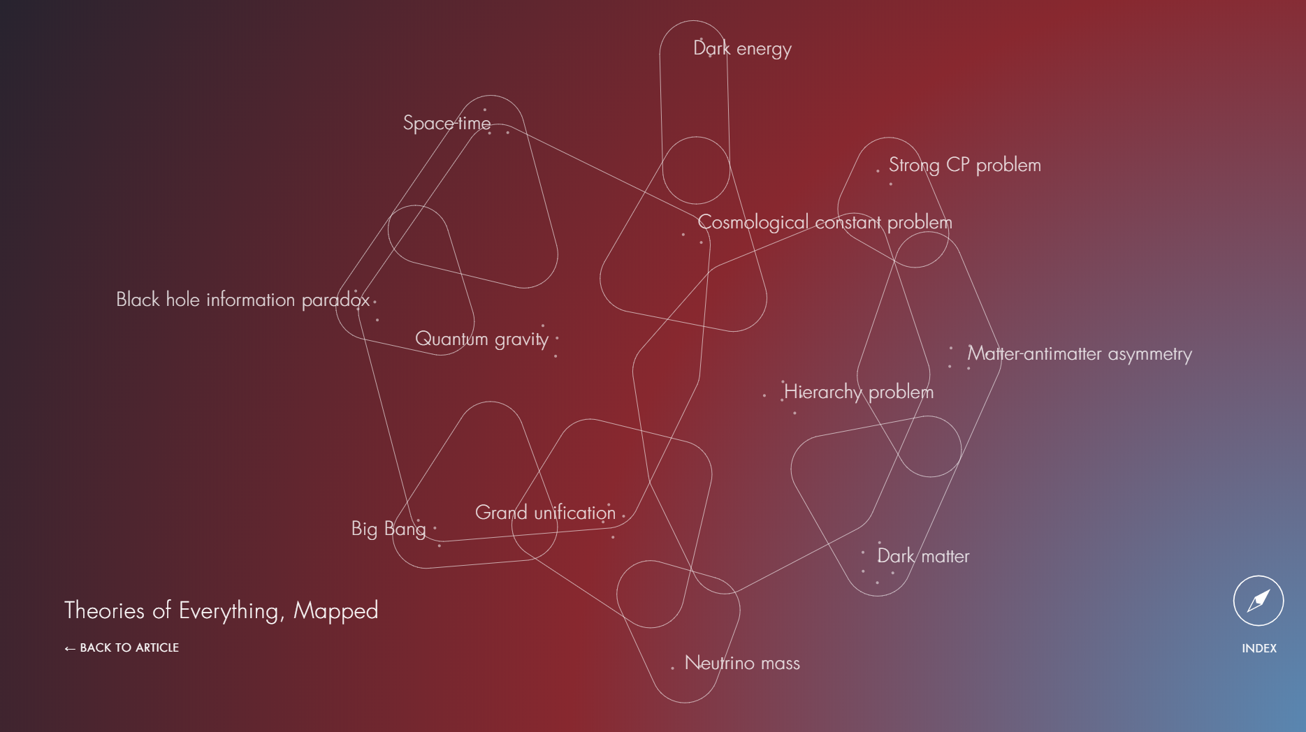 La théorie du tout est une approche scientifique qui permettrait de simplifier les lois qui, aujourd’hui, constituent les connaissances humaines de la physique sans ou autant être complète. Une théorie qui permettrait de relier la physique de l’infiniment petit (théories quantiques …) avec l’infiniment grand (Newton, Einstein…). Si l’envie vous en dit, nous vous proposons de mieux comprendre tous les termes liés à ses théories et leurs interactions via le site Theories of Everything, Mapped. Proposé par Quant magazine ; ce site cartographie non seulement les termes et grandes théories, mais les localise dans le champ de la recherche et leurs interactions. Passionnant et bon voyage dans la science!