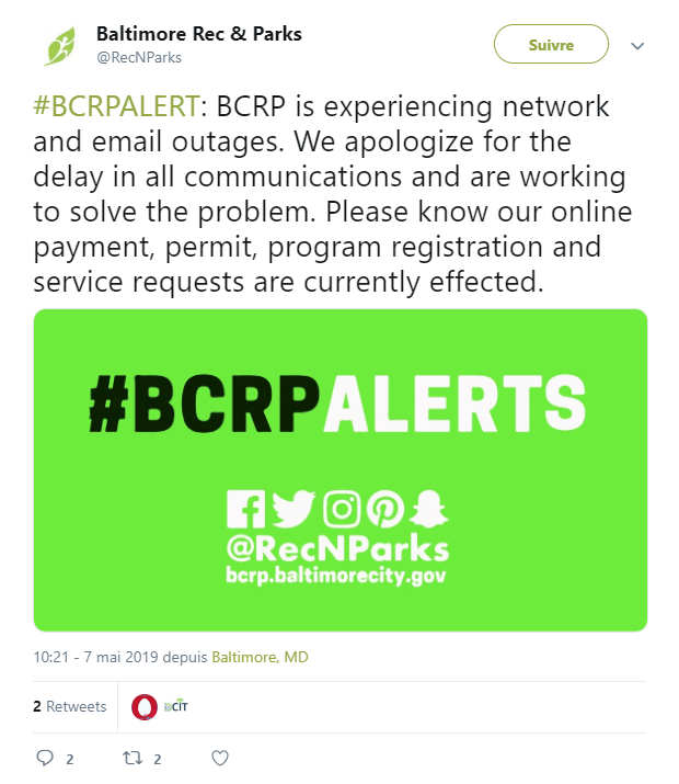 Mais cela ne se passe pas toujours aussi bien et c’est le cas de Baltimore qui n’a pas contracté d’assurance couvrant les risques d’hacking et qui est bloquée depuis le 3 mai 2019 par le Ransomware « RobbinHood » et la plupart des réseaux de Baltimore City ont été fermés suite à une attaque de Ransomware qui a détruit des serveurs de messagerie et d’autres systèmes dans plusieurs départements de la ville en date du 7 mai.