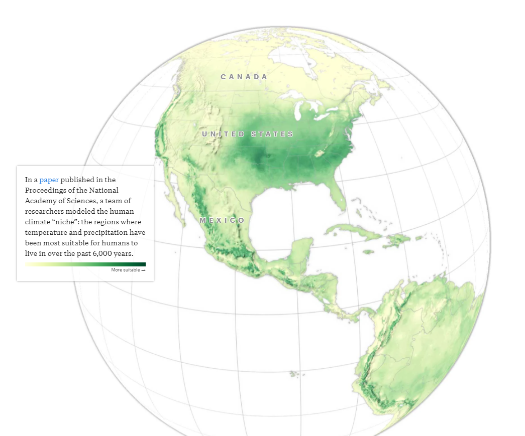 Pendant que le président des États-Unis envisage le refroidissement des terres après les incendies californiens et du reste de la côté ouest, ProRepublica qui est le Médor américain propose une nouvelle analyse de carte du changement climatique dans leur pays. Et cette fois-ci, l’intérêt est dans les commentaires liant les changements climatiques avec les migrations internes dans le pays. L’article New Climate Maps Show a Transformed United States regroupe des cartes dynamiques pour comprendre l’évolution des territoires et la migration vers les latitudes plus nordiques.