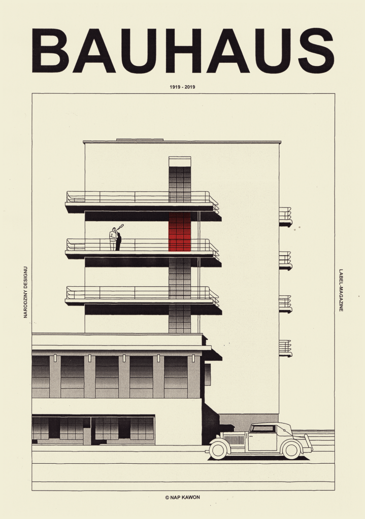 L’affiche montre le siège du Bauhaus à Dessau, construit en 1927, et la voiture Adler Standard 8, identique à celle utilisée par Walter Gropius.