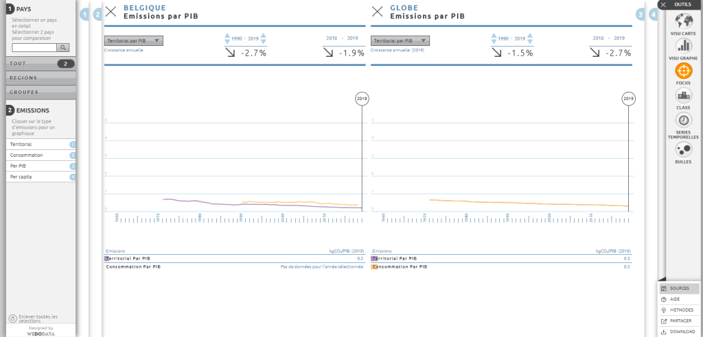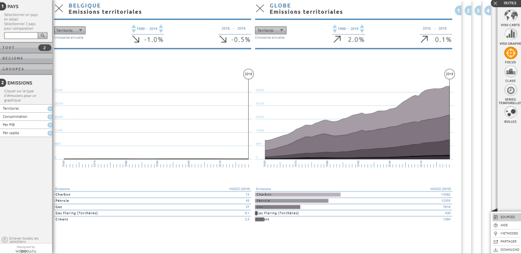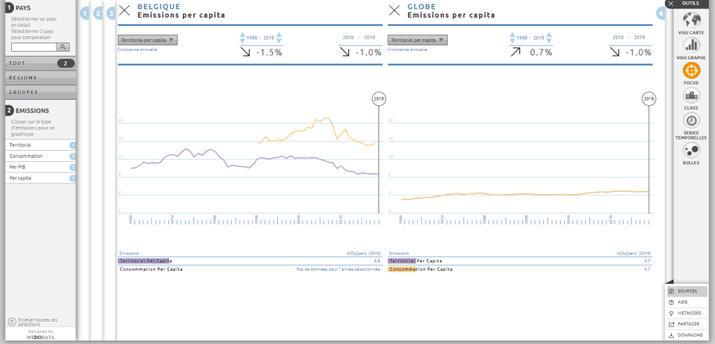 Quant aux matières premières (énergies fossiles) qui produisent le plus de rejets dans l’atmosphère, le charbon reste en tête même s’il semble stagner ces dernières années. Avec une croissance de 0.1% sur les 2 dernières années pour une moyenne 1990-2019 de +2%/an les énergies fossiles semblent maintenant stagner, corrélé par une émission de tkg.CO/an PIB qui diminue de 2.7% entre 2018-2019 pour respectivement -1.5% depuis 1990. À ce niveau, la Belgique s’en sort un petit peu mieux, mais les différences ne sont pas significatives. Or, en tant que pays occidental développé, plus nous stagnons, plus sera difficile d’atteindre les objectifs de l’UE de réduction de plus de 50% de nos rejets de CO₂ à l’aulne de 2050. Il est donc grand temps de se réveiller et d’agir.