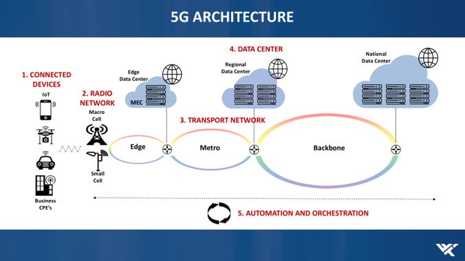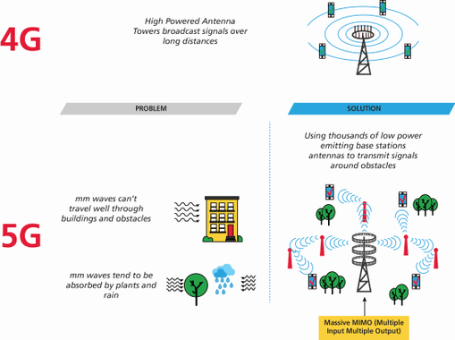 L’un des changements manifestes de la 5G est les antennes : elles vont être multipliées par 10, en commençant par votre Box Proximus, Voo, Orange. La raison est technique, car plus la fréquence d’émission (1.8 à 3.6 GHz pour la 4G ou 4G+ à 24-36 GHz pour la 5G), moins les ondes passent à travers les murs. Il faut donc des relais. La seconde raison est l’explosion des données transférées par la 5G. Une explosion équivalente à ce qui s’est passé avec l’Internet, plus le débit a augmenté. Cette forêt d’antennes est reliée à des hubs (une antenne parmi les antennes) qui reconnecteront les données au réseau terrestre pour envoyer les informations dans des datas centers.