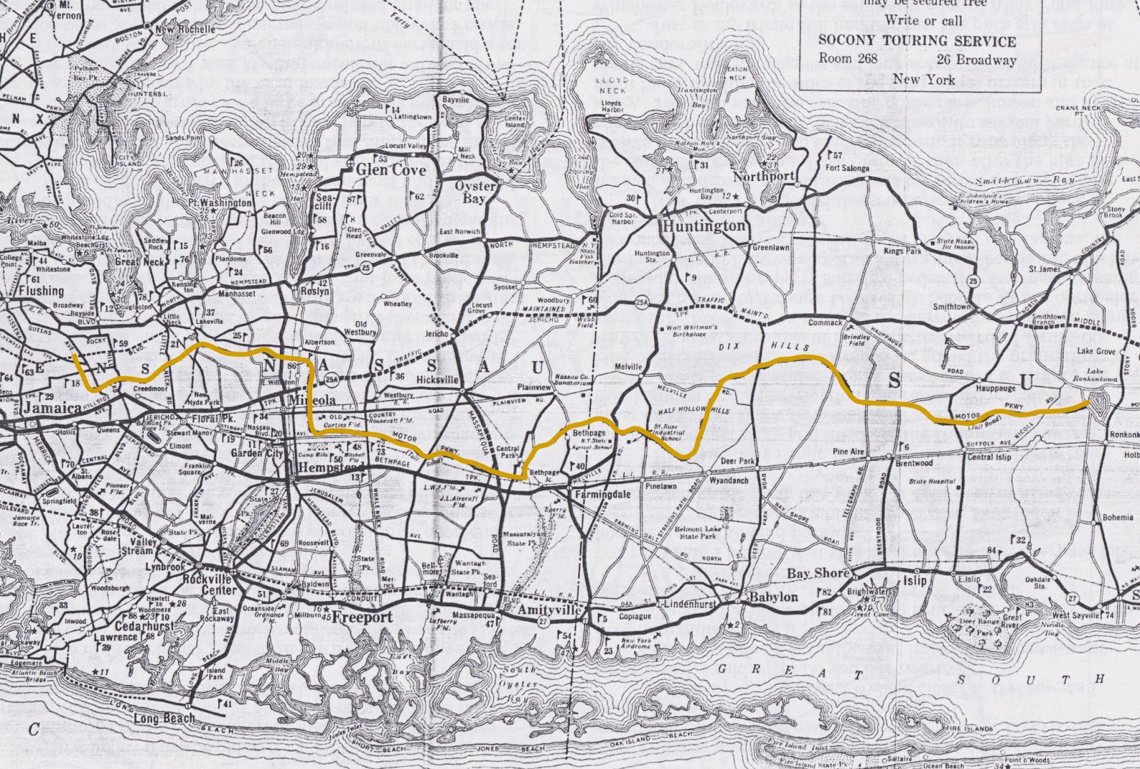 « La première route américaine conçue pour la conduite rapide fut la Long Island Motor Parkway, construite à titre privé par un homme riche pour lui et ses amis qui se rendaient de New York à leur propriété de Long Island. La promenade a été ouverte aux voitures en 1908 ; aujourd’hui, on peut marcher ou faire du vélo sur une partie de la route originale dans le Queens. Avec ses ponts au-dessus des rues et ses bretelles d’accès et de sortie, la Long Island Motor Parkway a établi le vocabulaire de conception de toutes les routes à accès limité qui ont suivi. »