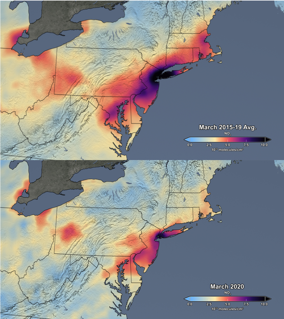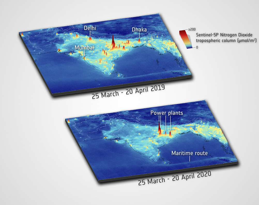 Afin d’atténuer la propagation du nouveau coronavirus, les responsables gouvernementaux et de la santé publique ont adopté diverses pratiques de distanciation sociale et d’autres mesures pour limiter les contacts humains, plaçant parfois des pays entiers en état d’urgence. Alors que le comportement humain a changé au cours de la pandémie, les mesures continues des instruments d’observation de la Terre ont détecté des changements simultanés dans les facteurs environnementaux, tels qu’une baisse du dioxyde d’azote (NO2), un polluant atmosphérique. Les données présentées ici, provenant de l’instrument de surveillance troposphérique (TROPOMI développé conjointement par les Pays-Bas et l’ESA) sur le satellite Copernicus Sentinel-5P de l’Agence spatiale européenne (ESA) et de l’instrument néerlando-finlandais Ozone Monitoring Instrument (OMI) sur le satellite Aura, montrent des baisses significatives des niveaux régionaux de dioxyde d’azote (NO2) qui coïncident avec la réduction du trafic et de l’activité industrielle. Les données sur le dioxyde d’azote pour tenir compte des variations de NO2 causées par les conditions météorologiques, telles que les nuages et le vent. On obtient ainsi une image plus claire de l’impact de l’activité humaine sur les niveaux de NO2. À Madrid, Milan, Rome et Paris, par exemple, les données TROPOMI montrent une réduction d’environ 50 % du NO2 du 13 mars au 13 avril 2020 par rapport aux mêmes mois de l’année précédente. Ces réductions coïncident avec la mise en œuvre de mesures de quarantaine strictes dans toute l’Europe. Des réductions similaires de la pollution atmosphérique ont été observées dans le nord-est des États-Unis. De Washington à Boston, les données moyennes de la colonne de NO2 de l’OMI pendant les lockdowns de mars 2020 étaient inférieures de 30 % aux données moyennes de mars 2015-2019. Les observations TROPOMI au-dessus de l’Inde ont également montré une diminution de la pollution atmosphérique pendant les lockdowns dans certaines villes, comme New Delhi et Mumbai. En comparant les mêmes périodes en 2019, les concentrations moyennes de NO2 du premier jour du lockdown le 25 mars au 20 avril, les données de 2020 montrent des réductions d’environ 40 à 50 % de la pollution atmosphérique. Cependant, les réductions de dioxyde d’azote n’étaient pas uniformes dans toute l’Inde. Le nord-est de l’Inde a montré des valeurs presque constantes de niveaux de NO2 en raison des opérations en cours dans les centrales électriques à charbon, qui n’ont pas réduit la production d’électricité de manière significative pendant le lockdown. De même, alors que le confinement à la maison et les autres restrictions de confinement commencent à s’atténuer, l’OMI et TROPOMI observent un rebond des niveaux de dioxyde d’azote.