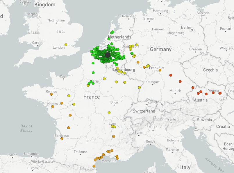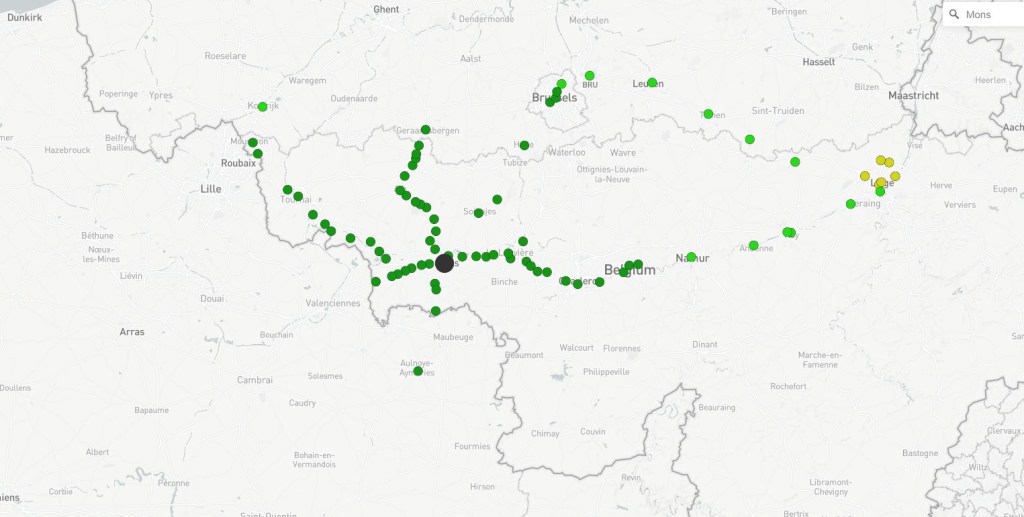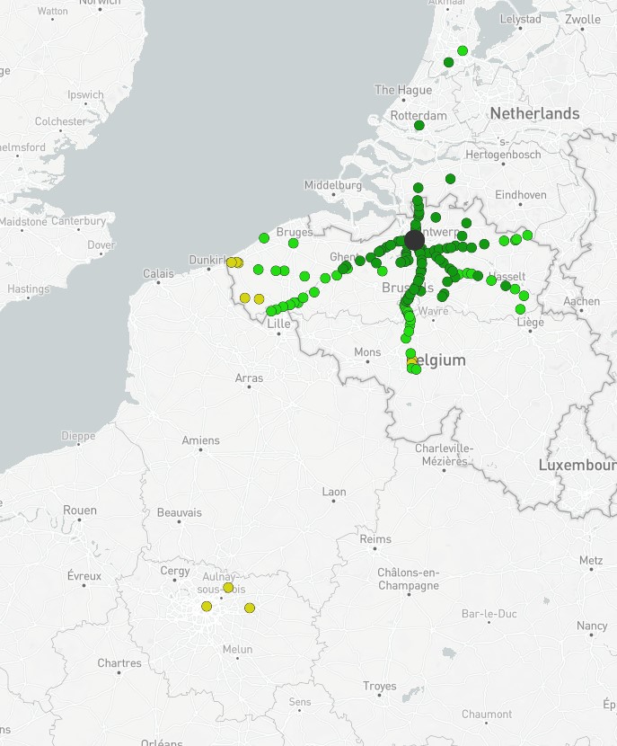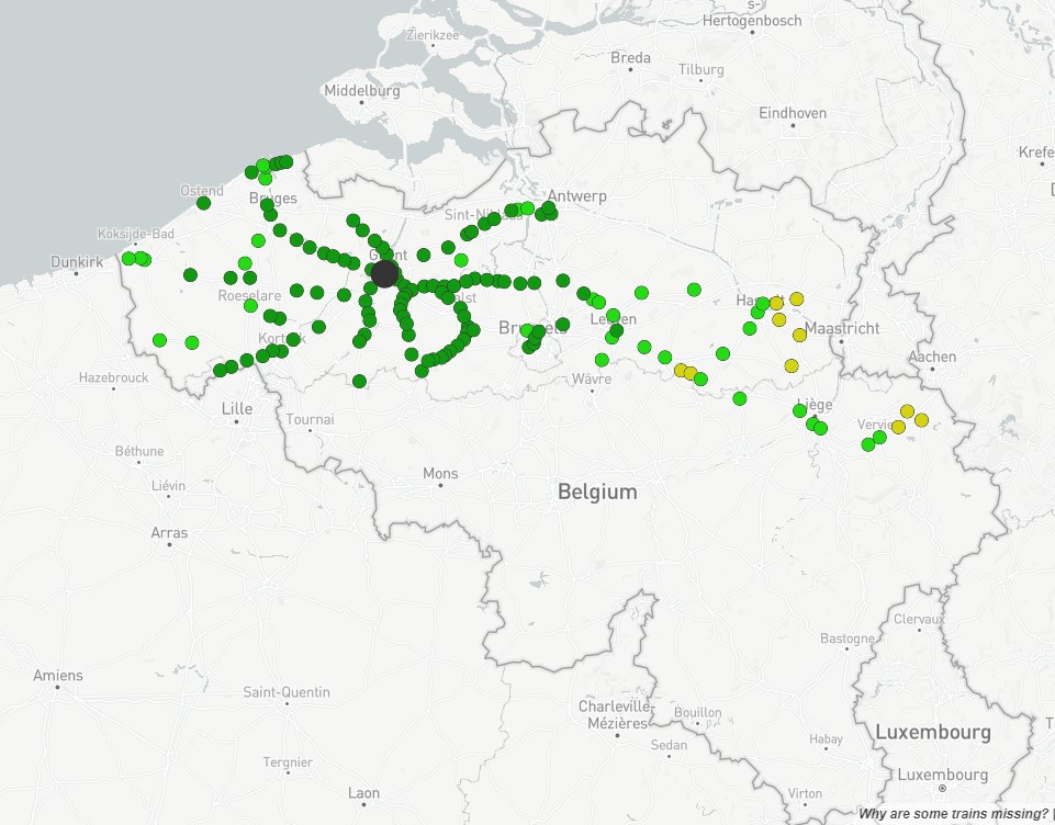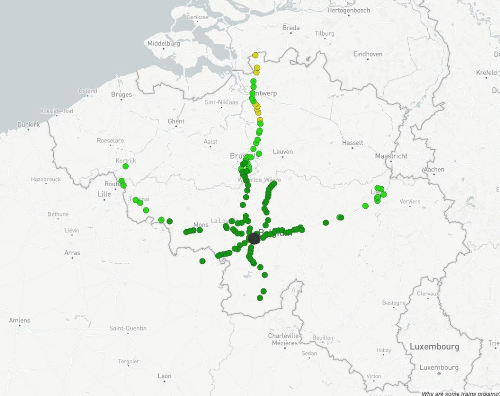 Outre le côté ludique du site, comparez Londres avec saint Pancras et Paris Nord pour essayer, vous serez surpris, il est intéressant de s’arrêter aux gares belges. De fait, cette analyse permet, sans entrer dans les détails, de regarder les aires d’influence des villes. Nous nous arrêterons ici aux 5 plus grandes villes de Belgique : Bruxelles (midi), Anvers, Liège, Charleroi et Gand. Les cartes sont proposées ci-après et soumises à des discussions :