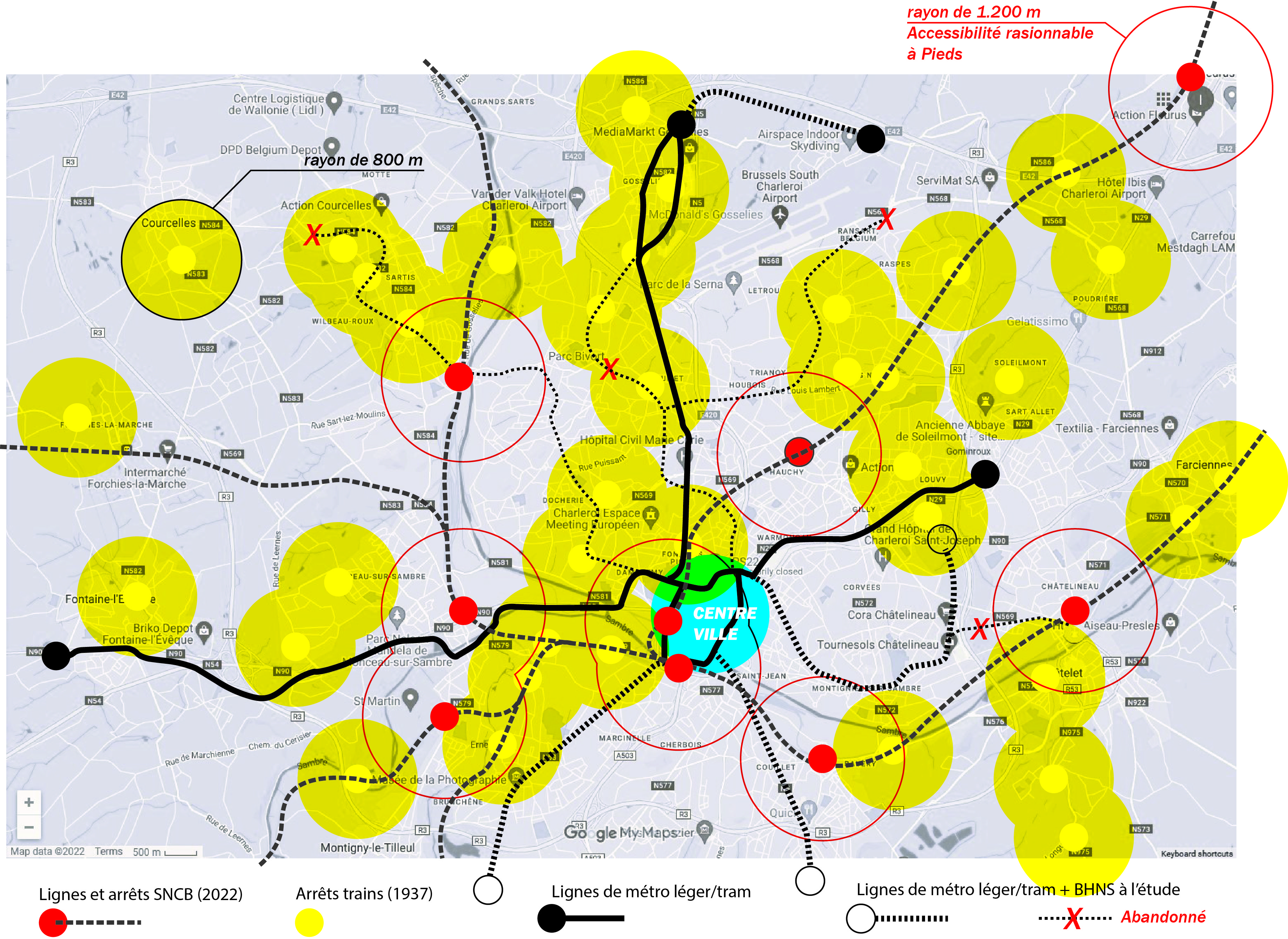 Si nous analysons de plus près la cartographie des lignes au sein de l’agglomération carolorégienne, on constate que ces lignes devaient être remplacées par l’étoile du métro léger de Charleroi et qui n’a malheureusement jamais été mené à bien. Par comparaison, nous proposons ci-après une carte reprenant les stations de train et entourées lorsqu’elles ont été remplacées par une station de métro ou conservées.