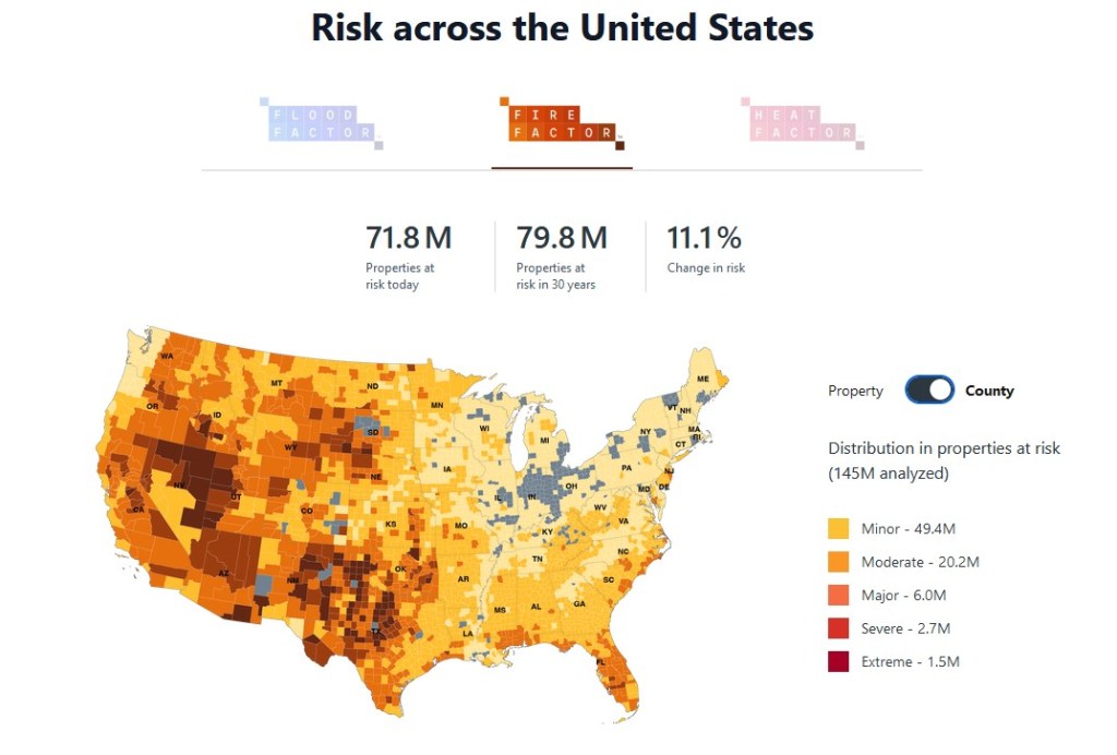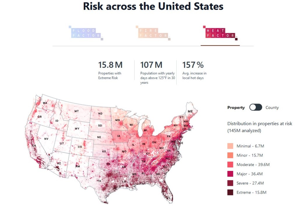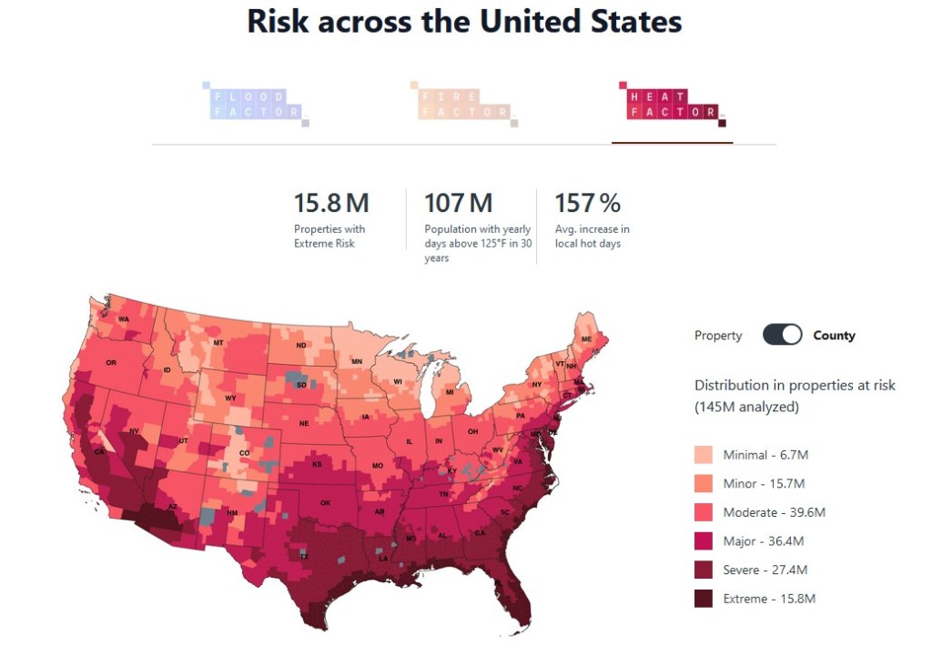 Les USA m’étonneront toujours. Alors qu’au moment où je vous écris ces quelques lignes, nous sortons lentement d’un été torride, je suis tombé sur cet article de Fast Company, média américain plutôt techno-sociétal. Il propose un article sur le travail mené par les sociétés immobilières américaines sur les types de risques à l’échelle de chaque conté des États-Unis, soit une distribution de données sur 3.077 territoires distincts.