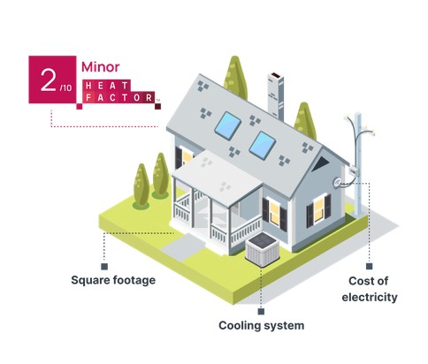 - Heat Factor™ prend en compte la distance de la propriété par rapport à l’eau, l’utilisation du sol et l’élévation relative pour déterminer la gravité de la chaleur extrême sur la propriété et calculer le coût pour rester au frais.