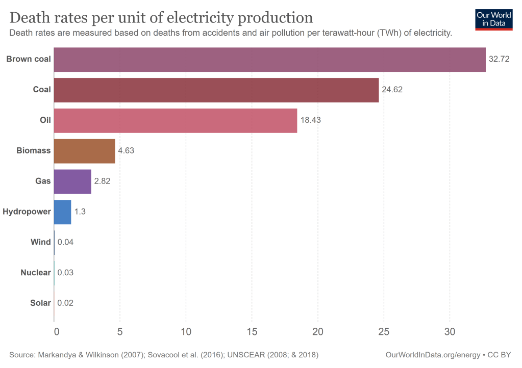 Parfois je suis très (trop) bavard, mais parfois, il suffit de quelques graphiques pour dire beaucoup de choses. Les 2 éléments graphiques qui suivent sont issus d’études scientifiques de qualité et proposent de jauger la corrélation entre le type d’énergie produite et le nombre de morts que cette production génère. En effet, lorsqu’on produit de l’électricité avec du charbon, on se doute bien qu’il y a énormément de microparticules de pollution qui sont générées. Ces particules dans l’air tuent (c’est prouvé).