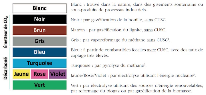 La production de l’hydrogène est devenue un arc-en-ciel de couleurs, selon les différents modes de production et rappelons que seul l’Hydrogène vert et blanc sont réellement durable. Les hydrogènes produits à base d’hydrocarbures sont plus polluants que le… diesel et l’essence ! (hydrogène ou électrique, ma voiture balance, publié le 18 novembre 2022).