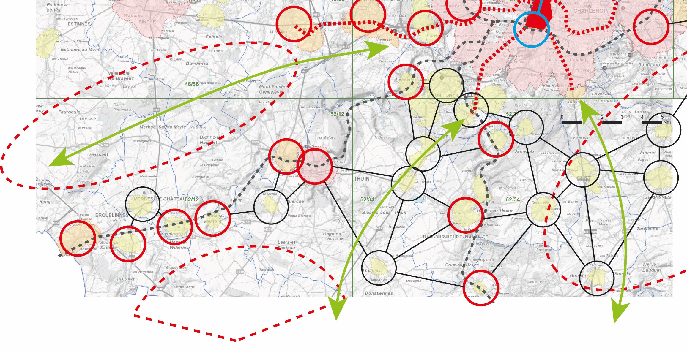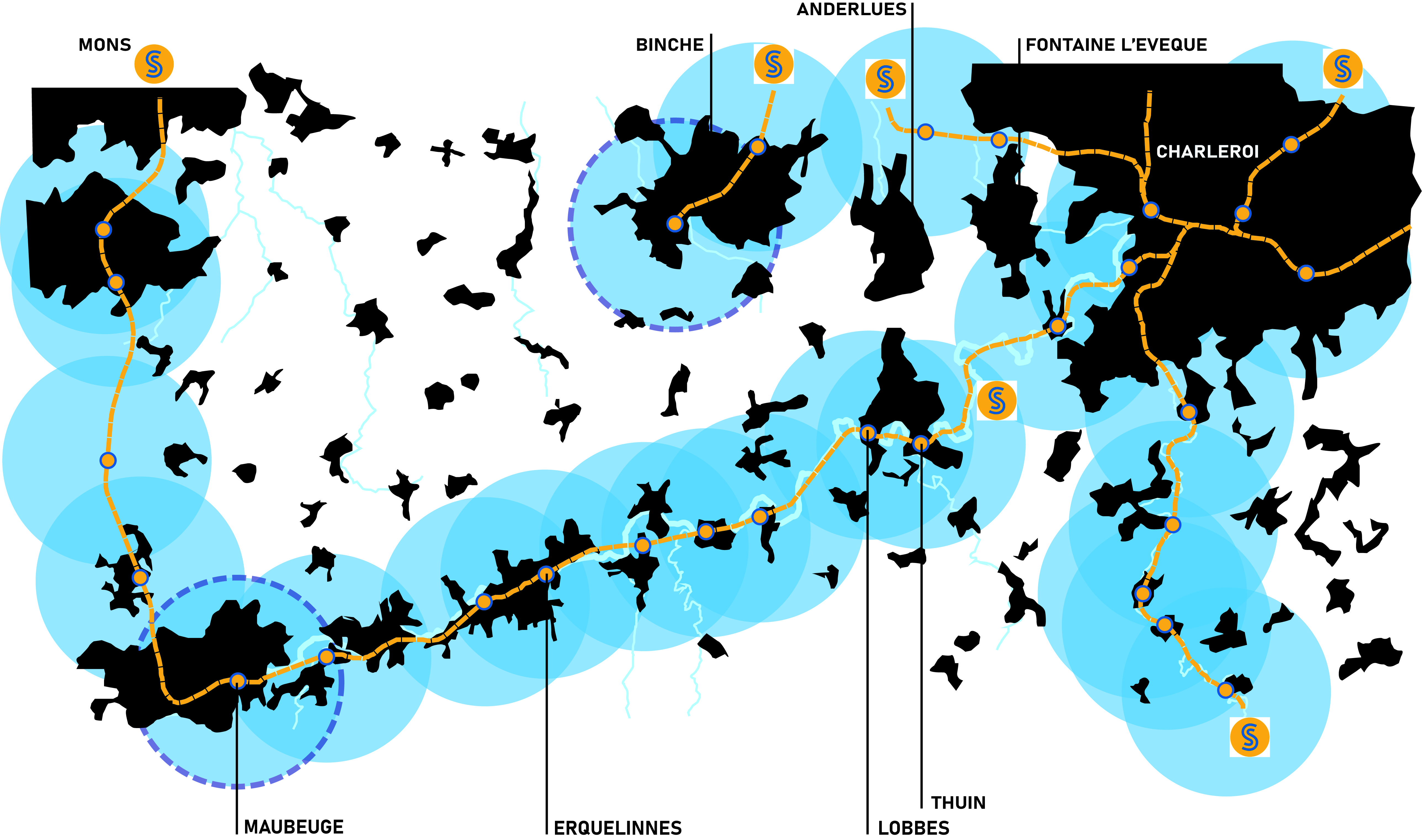 Et au-delà, certains territoires comme le plateau thudinien sont désertés avec seulement des centralités villageoises liées à un arrêt de train dans la vallée de la Sambre, délaissant alors tout le maillage des villages entre Binche, Erquelinnes et Charleroi, ensemble d’un territoire fortement lié aux déplacement et développement économique de la métropole.