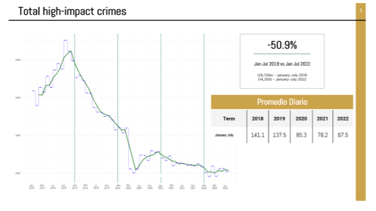 - Enquêtes, statistiques et géolocalisations des données. En d‘autres termes, le renseignement. Aujourd’hui, la police dispose d’un sous-secrétaire au renseignement et aux enquêtes qui produit des informations pertinentes renforçant les activités de la police et la prévention de la criminalité. Aujourd’hui, la ville dispose d’une richesse d’enquêtes et de dossiers de police solides, qui ont permis d’arrêter des criminels et d’affaiblir les organisations criminelles les plus importantes opérant dans la ville. Cette nouvelle stratégie a apporté une contribution significative à la réduction du niveau de violence et a contribué à produire le taux d’homicides le plus bas de l’histoire depuis le début des statistiques systématiques sur l’incidence criminelle dans le pays en 1997.