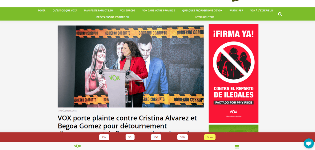 Derrière cette phrase il y a de nombreuses choses à dire. La première est qu’elle n’a pas de lien exclusif avec l’Espagne, contrairement au parti VOX, clairement d’extrême droite, même s’il s’efforce de se présenter sous une forme démocratique pour les élections. En effet, à visiter son site et sa page principale, il est difficile de ne pas comprendre ses tendances claires, extrait ci-dessous :