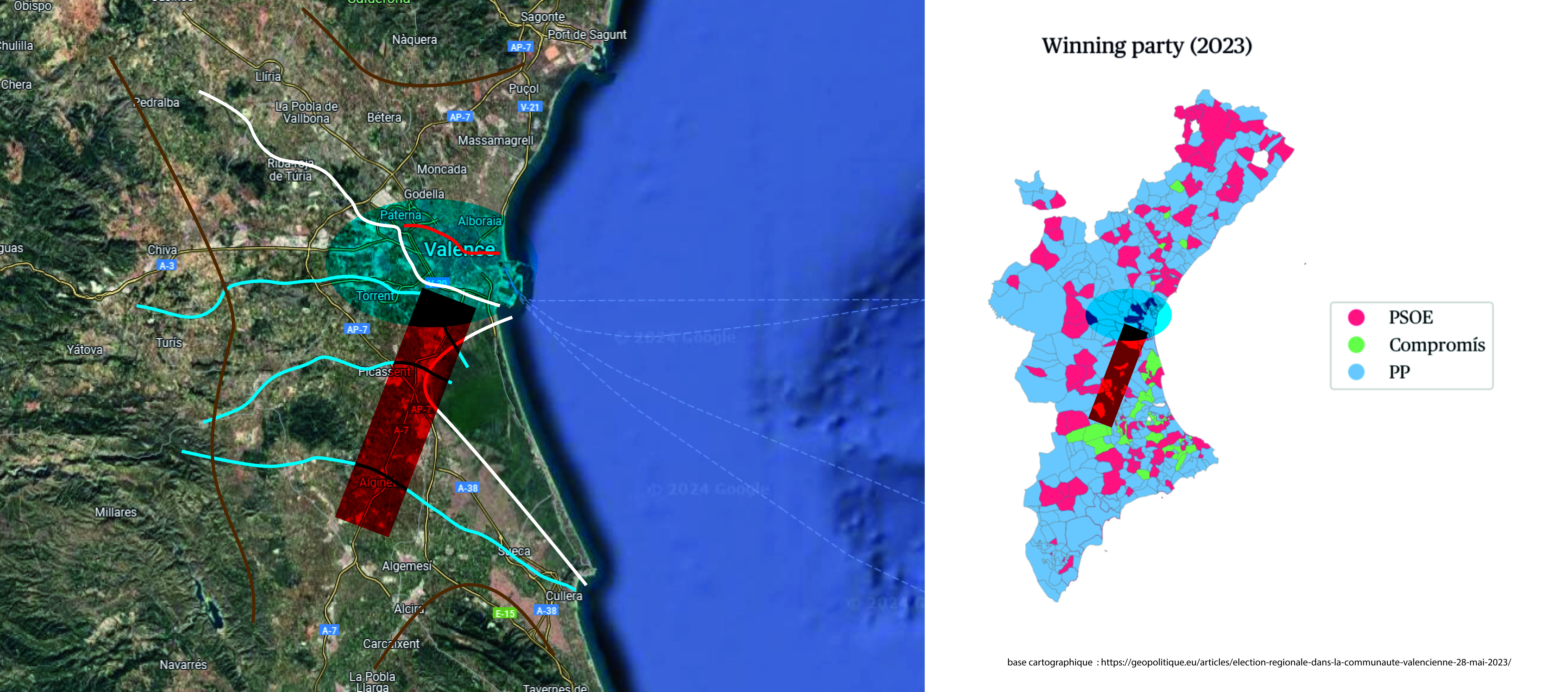 Lorsqu’on croise les cartes avec les chiffres, on constate que de nombreux votants VOX sont dans la même zone. Le paradoxe de cette situation est que les « votants de bonne foi » se sont rapprochés de l’attractivité de VOX non pas pour des raisons racistes, mais bien climatiques. Ils considèrent que les politiques de gauche leur retirent des droits acquis, tels que l’accès aux villes pour les vieux véhicules, ou encore la réduction des terrains à bâtir consommables, ce qui fait inévitablement augmenter le prix de l’accès à la propriété. Aujourd’hui ils ont tout perdu, surtout des vies, car ils n’ont pas été prévenus par un système construit par la gauche et qui a été démantelé par une droite radicale.
