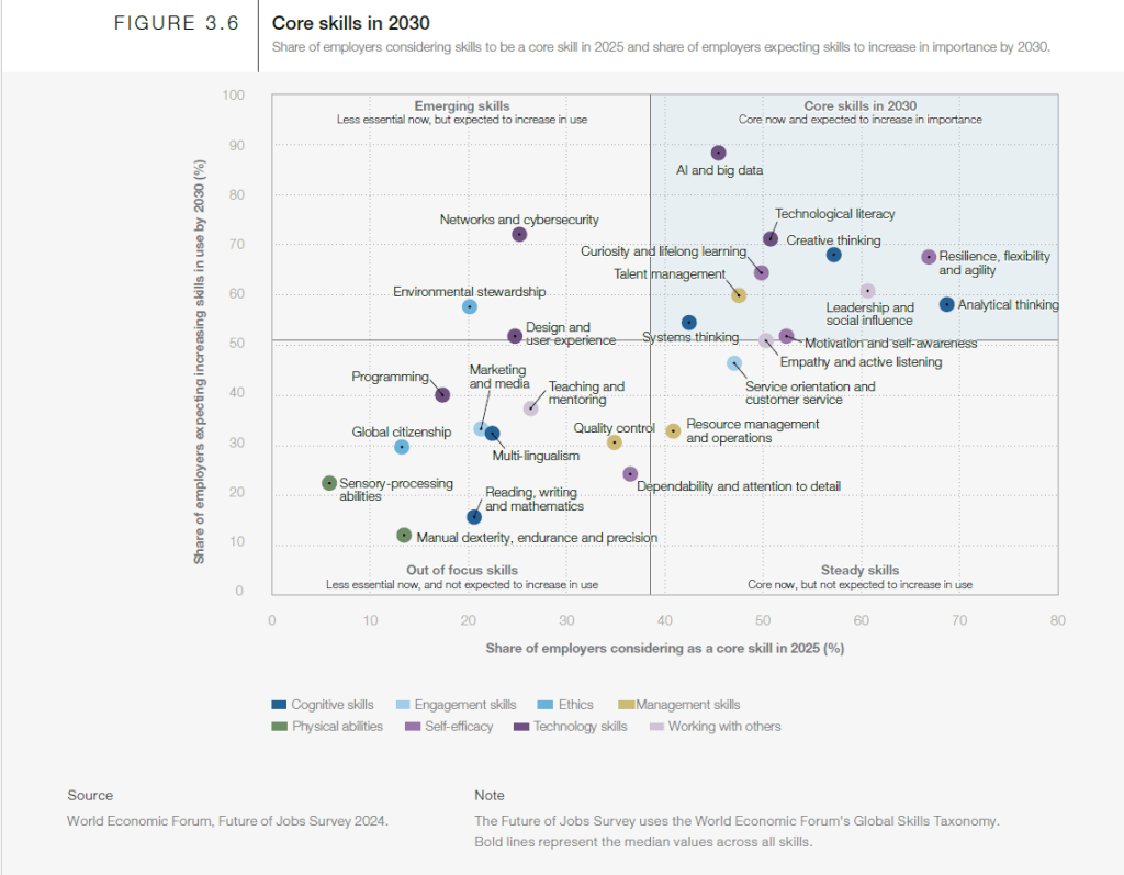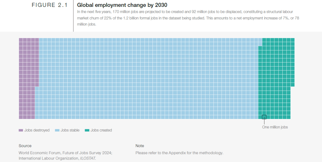 En extrapolant à partir des prévisions partagées par les répondants à l’enquête « Future of Jobs Survey » sur les tendances actuelles pour la période 2025-2030, la création et la destruction d’emplois dues à la transformation structurelle du marché du travail représenteront 22 % du total des emplois actuels. Cela devrait entraîner la création de nouveaux emplois équivalents à 14 % de l’emploi total actuel, soit 170 millions d’emplois. Toutefois, cette croissance devrait être compensée par la suppression de l’équivalent de 8 % (soit 92 millions) d’emplois actuels, ce qui se traduira par une croissance nette de 7 % de l’emploi total, soit 78 millions d’emplois. En somme, le rapport souligne l’importance d’une adaptation proactive face aux transformations induites par l’IA, afin de minimiser les impacts négatifs sur l’emploi et de tirer parti des nouvelles opportunités professionnelles.