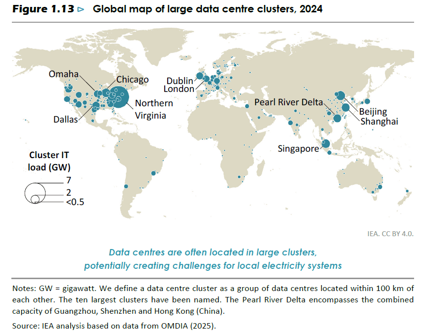 Derrière les prouesses de l’IA générative ou des robots autonomes se cache une infrastructure gourmande : les centres de données (data center en bon anglais), véritables centrales nerveuses numériques. En 2024, ils consommaient déjà 1,5 % de l’électricité mondiale, et ce chiffre devrait plus que doubler d’ici 2030, atteignant 945 TWh – soit l’équivalent de la consommation annuelle du Japon. Les États-Unis, la Chine et l’Europe se partagent l’essentiel de cette demande, avec des clusters de centres très concentrés qui peuvent exercer une pression locale sur les réseaux. Tout cela est repris dans le dernier rapport de l’IEA (International Energy Agency) qui délivre son rapport ici.
