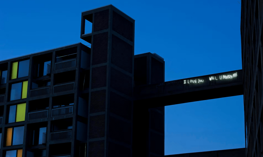 « Jason n’a pas regardé en bas, il a le vertige et il était à 13 étages. Il s’est penché dans sa veste Puffa jaune et a pulvérisé son nom. « Clare » est sorti au hasard et « Middleton » a touché le rebord. Il avait prévu de l’emmener au Roxy, sur la colline d’en face, pour lui montrer. Alors il recommença, plus grand, plus clair : « JE T’AIME VEUX-TU M’ÉPOUSER ». Il a levé les deux doigts vers le bureau des services sociaux situé en face. Il s’est éclipsé. Voyant cela, Grenville, l’un des gardiens du domaine, a dit au bureau sur place : « Comment allons-nous l’enlever ? » (…) Les graffitis sont restés, au-dessus de la ville, tandis que la ville se demandait ce qu’il fallait faire des appartements. Park Hill, la cité de béton située derrière la gare, était devenue tristement célèbre. La ville projetait l’abandon sur Park Hill, de sorte que les graffitis commençaient à ressembler à des cris d’amour poussés à tue-tête dans un quartier que l’on croyait désolé. »
